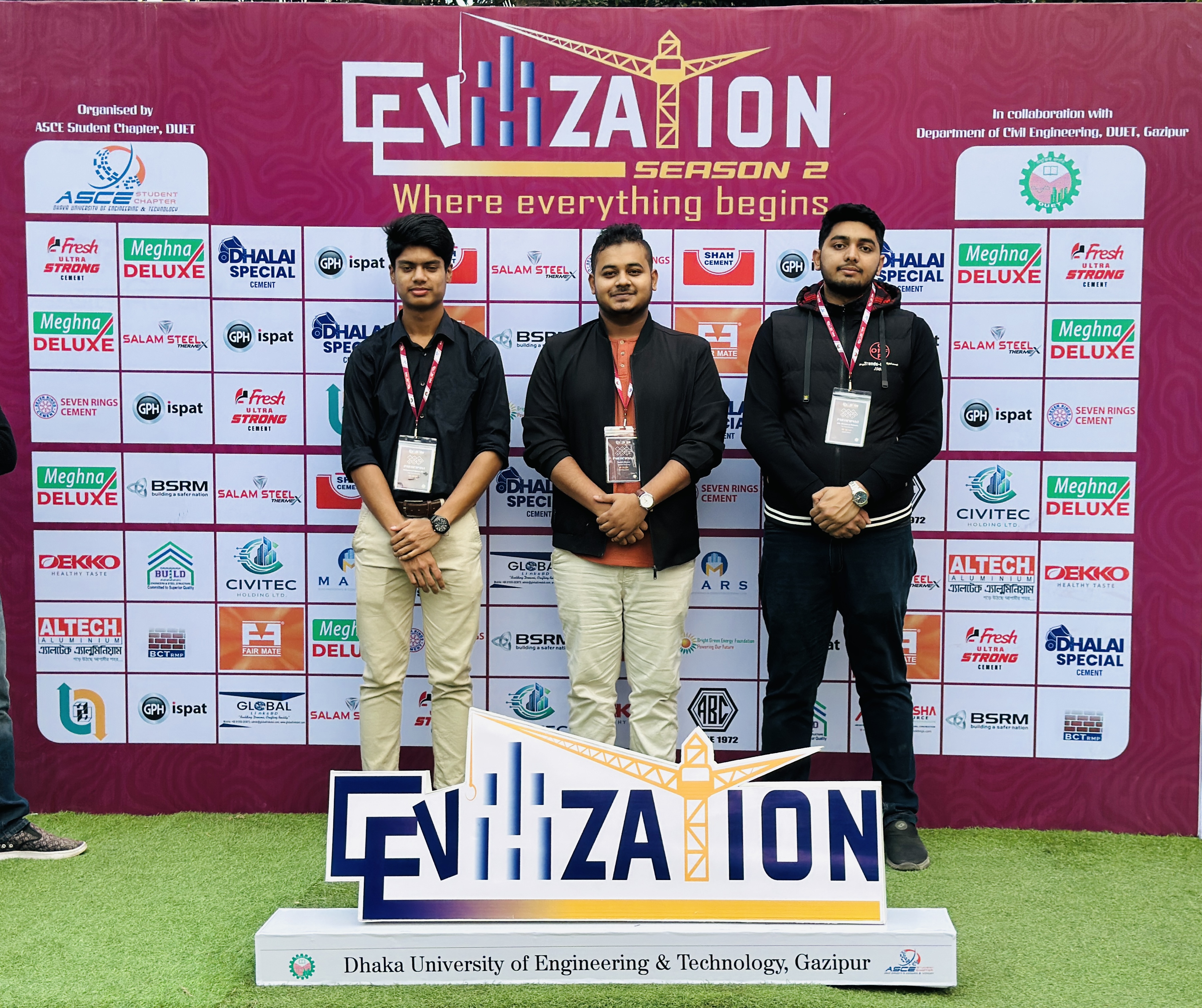 CIvilization Season 02 was successfully held on 10 January 2026 at Dhaka University of Engineering and Technology (DUET), Gazipur, organized by the ASCE Student Chapter, DUET, in collaboration with the Department of Civil Engineering, DUET. The event brought together civil engineering students from various universities, encouraging innovation, technical excellence, and problem-solving skills. East West University actively participated in multiple segments. Team Achievers, comprising Rownok Hasan Rafi, Akmam Ur Rahman, and Mohammad Ayman Khan, competed in the Quack Quest segment with a project on earthquake-resistant structures. Yeamin Dewan Abir took part in the Drafting segment, while Team 3 Zero, Md. Sadik Jamal Kowshik and Md. Tanvir Alam, represented EWU in the Poster Presentation Competition, highlighting research and presentation skills.