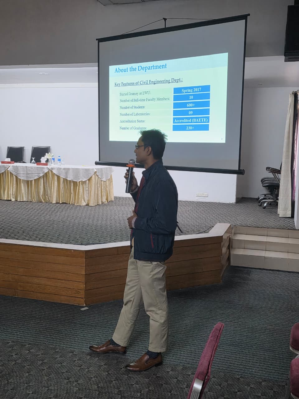 Departmental presentations began at 10:45 AM, covering six departments. The Department of Civil Engineering (CE) showed significant progress with BAETE accreditation, 70% PhD-qualified faculty, and nine operational laboratories. Strengths included high teaching quality and students course completion, rising research output, with high publication record per faculty between 2024–2025.