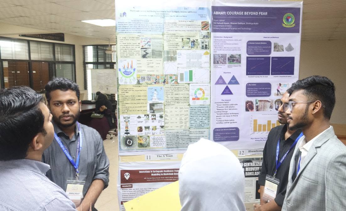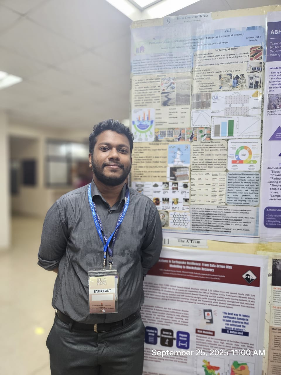 A team from East West University’s Department of Civil Engineering Team Concrete Heroes comprising Md. Sadik Jamal Kowshik, Md. Tanvir Alam, and Ariful Islam Bhuiyan actively participated in the Poster Presentation Competition at National Disaster Management Exercise (DMX) 4.0, held at Bangladesh University of Professionals (BUP) on 24–25 September 2025. Their poster, “PlastiGraph Concrete: Self-Healing Innovation for Smart Earthquake Response and Recovery,” showcased a sustainable material solution for post-disaster resilience. The event fostered innovation and collaboration toward building a safer, earthquake-resilient Bangladesh.